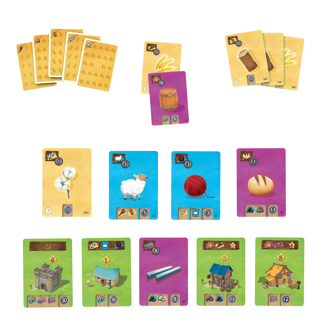 - Торгівля або виробництво. Під час цього кроку ви можете отримати одну карту з середини столу, сплативши її ціну у ресурсах або монетах. Вгорі на кожній карті зазначено її курс продажу у монетах. "Продайте" декілька карт, відправляючи їх до скиду, щоб сплатити вартість у монетах, або скиньте карти відповідних ресурсів, щоб "виготовити" карту з середини столу. Пам'ятайте, що у вас на руці ніколи не може бути більш як 7 карт ресурсів. Карти будівель ви відразу викладаєте перед собою, тож до ліміту вони не рахуються.
