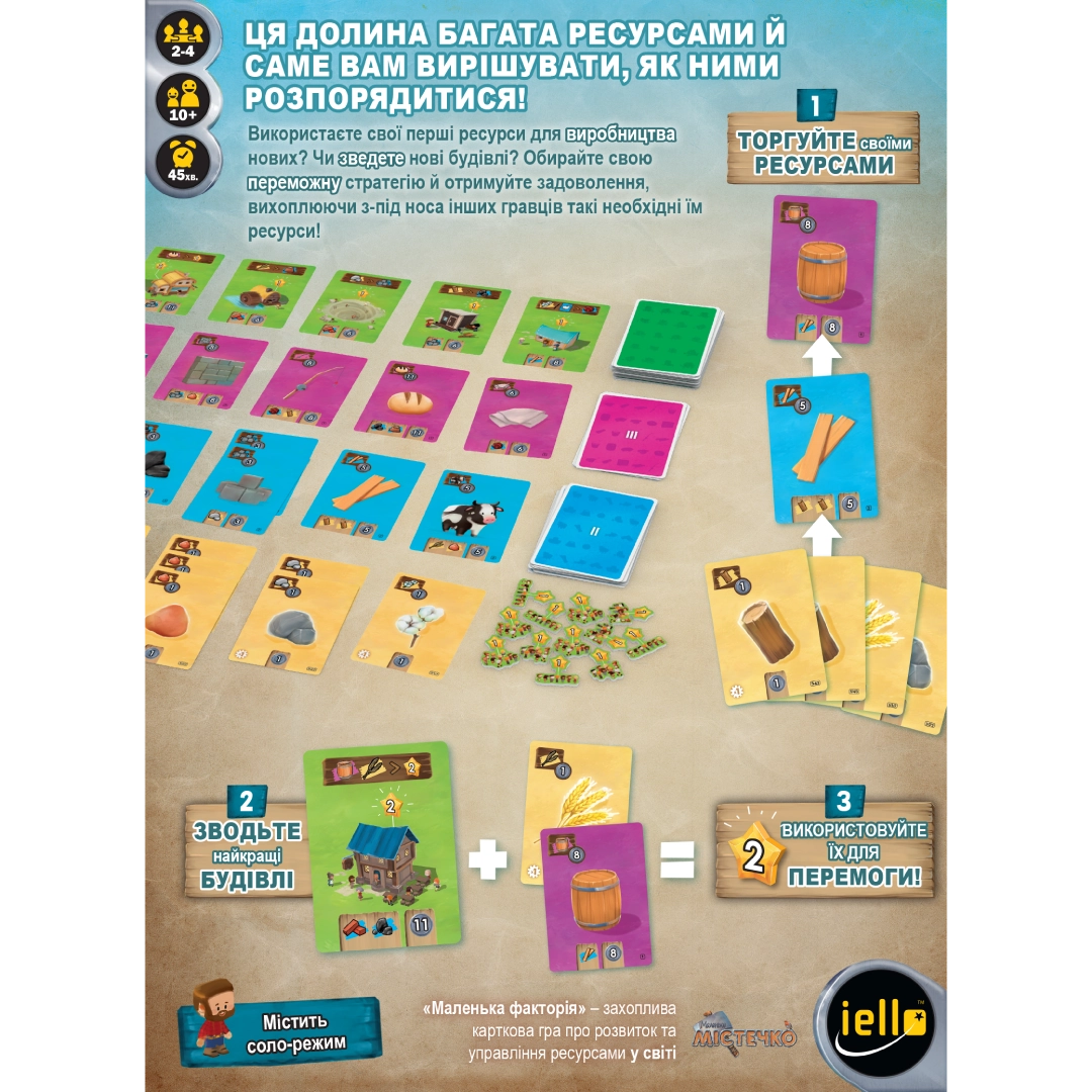 Якщо ви вже побудували «Маленьке містечко», чи якщо вам більше припадає до душі заміська романтика, вирушайте до розвитку свого виробництва у настільній грі «Маленька факторія». З п'яти базових ресурсів ви за комбінації карт та використання знарядь зможете створити величезну кількість корисних речей та кінцевих продуктів! Ланцюжок виробництва у грі з кількома способами здобути певний матеріал та послідовною комбінацією рецептів детально змальований в ілюстрованій схемі у правилах, а динамічний картковий рушій робить партії зі стратегічним розрахунком швидкими та захопливими.