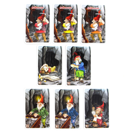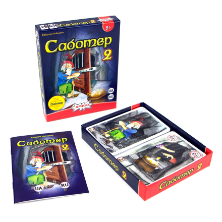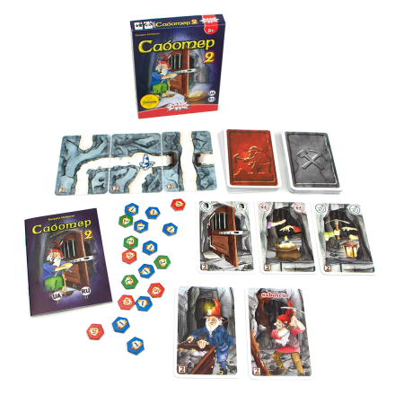 «Saboteur 2» - мастхевне доповнення для чудової паті-гри «Саботер». У комплекті нові карти ролей, нові карти незвичайних шляхів, нові карти витончених дій, а також жетони золотих самородків, якими можна замінити аналогічні карти з базової гри.