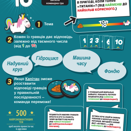 Пс, друже! Шукаєш щось веселе і навіть трохи легковажне для супер-пупер гік паті? Уже познайомився з «Одним словом» та «Кодовими іменами», і прагнеш чогось більшого, ніж «Еліас для вечірки»? Тоді саме для тебе Гікач припасли компанійську призерку конкурсів сайту Вoardgamegeek 2020-2021 років з простою й дещо кумедною назвою «Тіп топ» («Top ten»)!