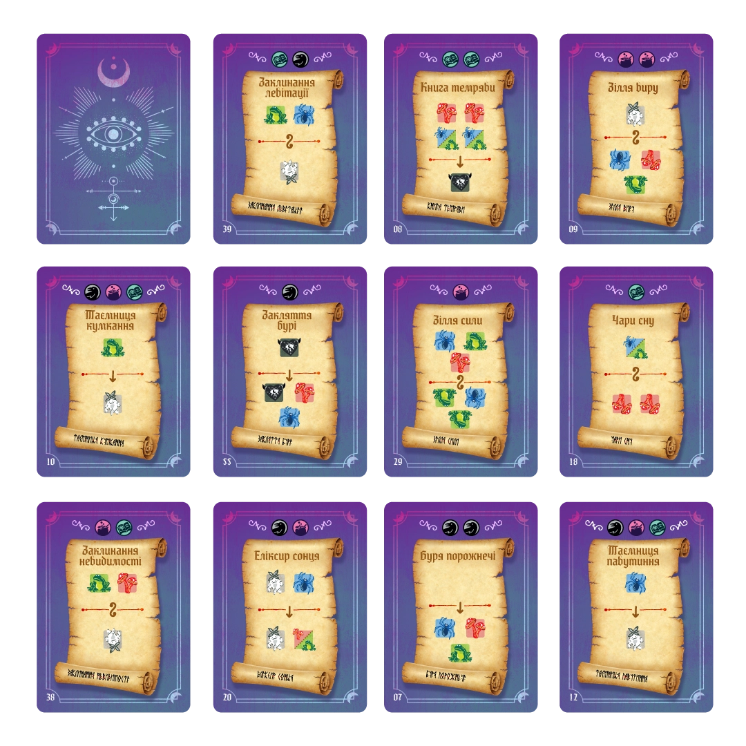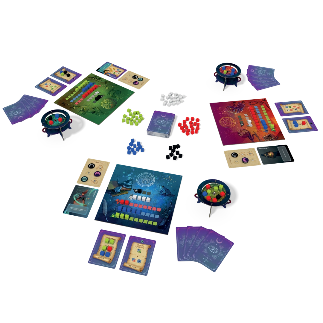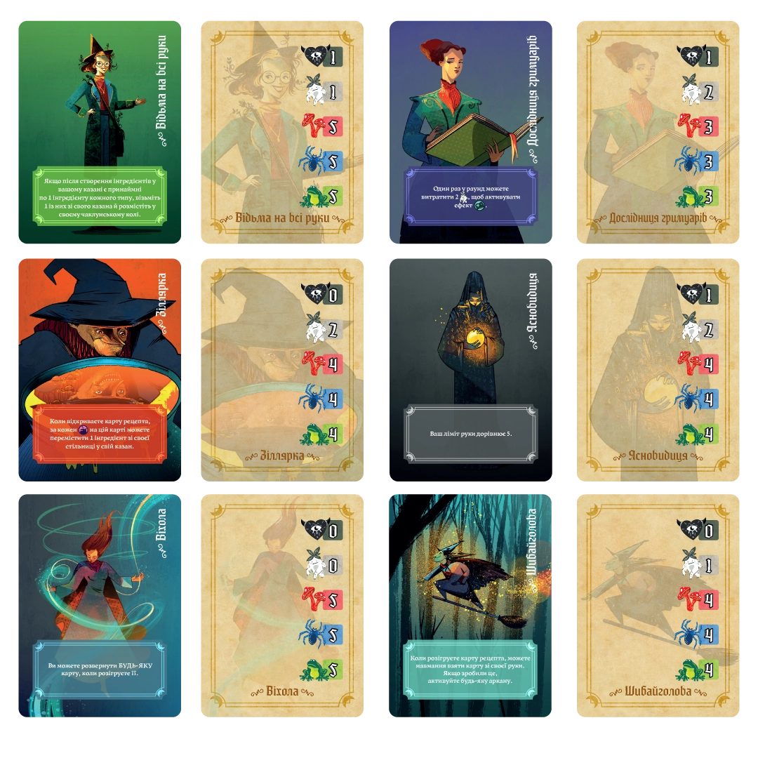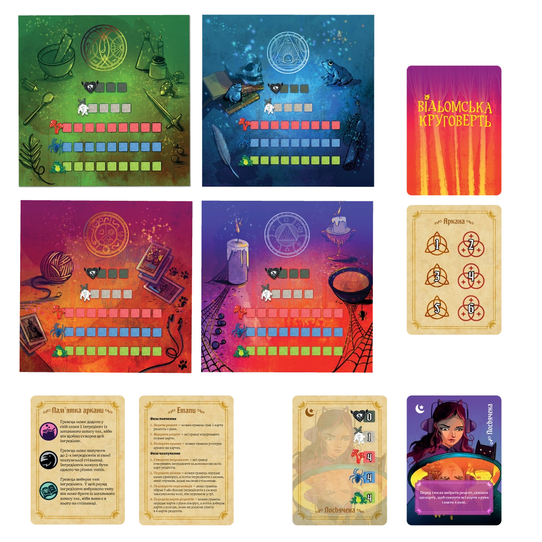 - Роздайте кожному гравцеві планшет стільниці, зібрану картонну фігурку казана, карту аркани, пам'ятку та карту відьми. Для першої гри рекомендовано вибрати для усіх гравців карти «Посвячених», і вже потому, як ви ознайомитесь з ігроладом, роздавати усім учасникам по дві випадкових карти, з яких вони мусять обрати й залишити собі одну.