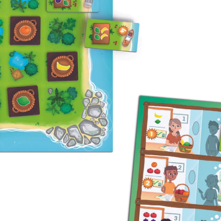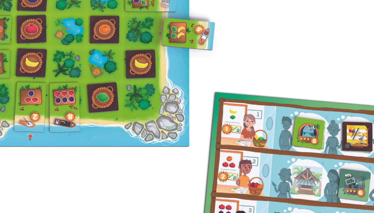 - Човни. На планшеті гравця розміщуються 12 човнів, на кожному з яких зображено скільки та яких фруктів потрібно, щоб він вирушив до покупців. Виконуючи ці умови, гравці скидають потрібну кількість фруктів та прибирають плитку човна з планшета, звільняючи на острові додаткове містечко під збирання врожаю.
