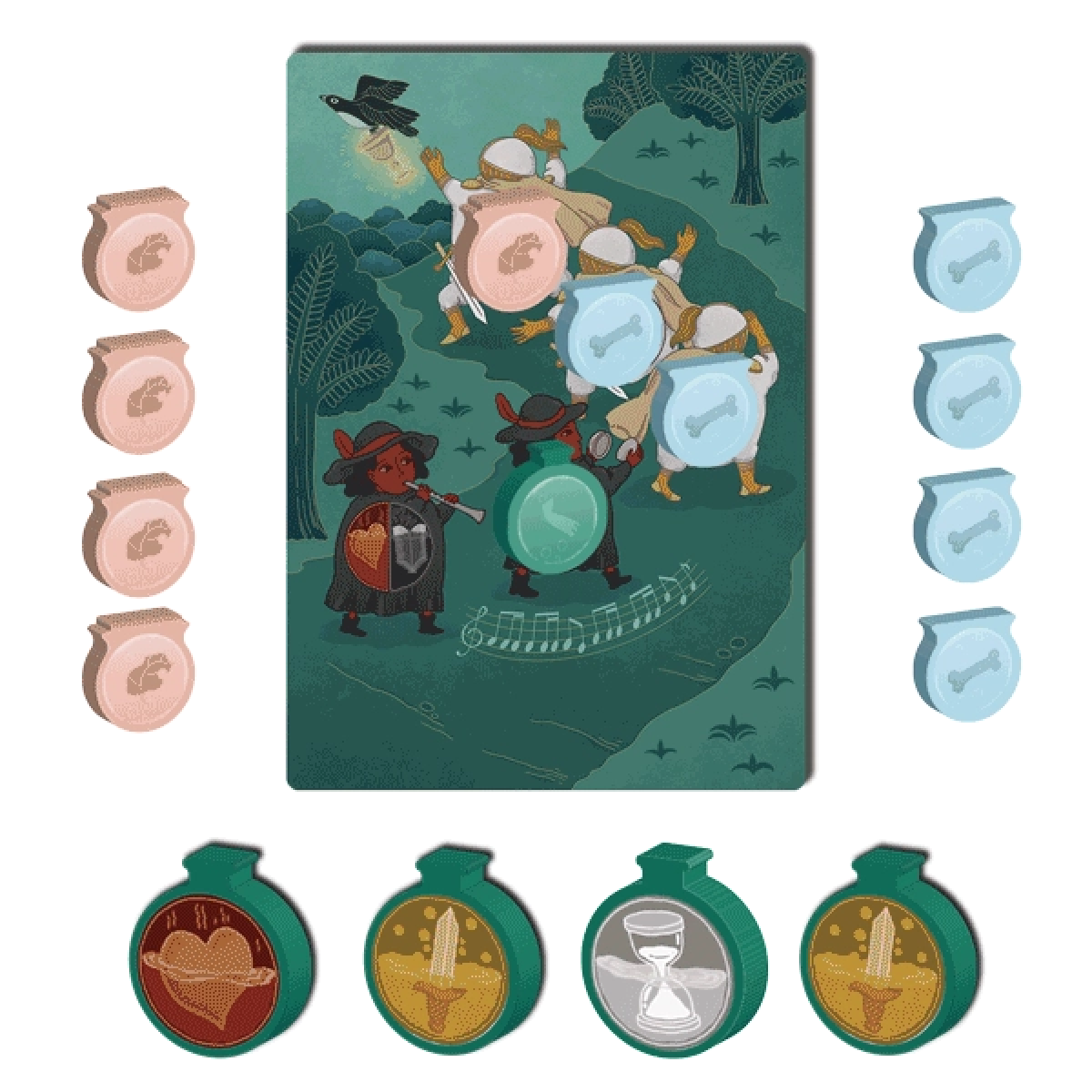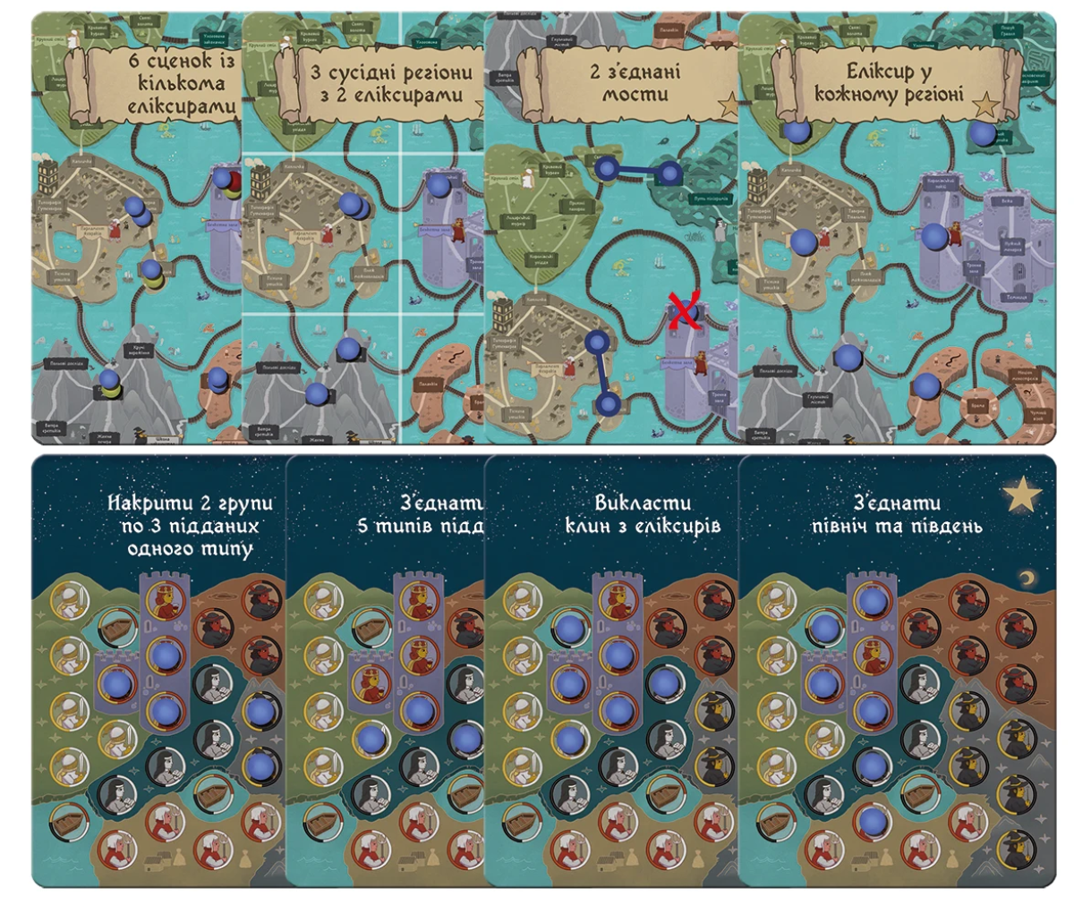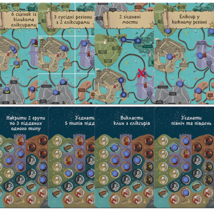 - Випадково виберіть чотири карти цілей та розташуйте їх над полем. Вони вказують патерни, які гравці мають зібрати зі своїх жетонів зіллячок у комірках поля, аби виконати ціль та наблизитися до перемоги.