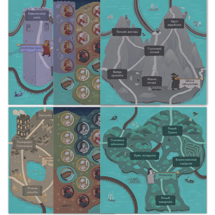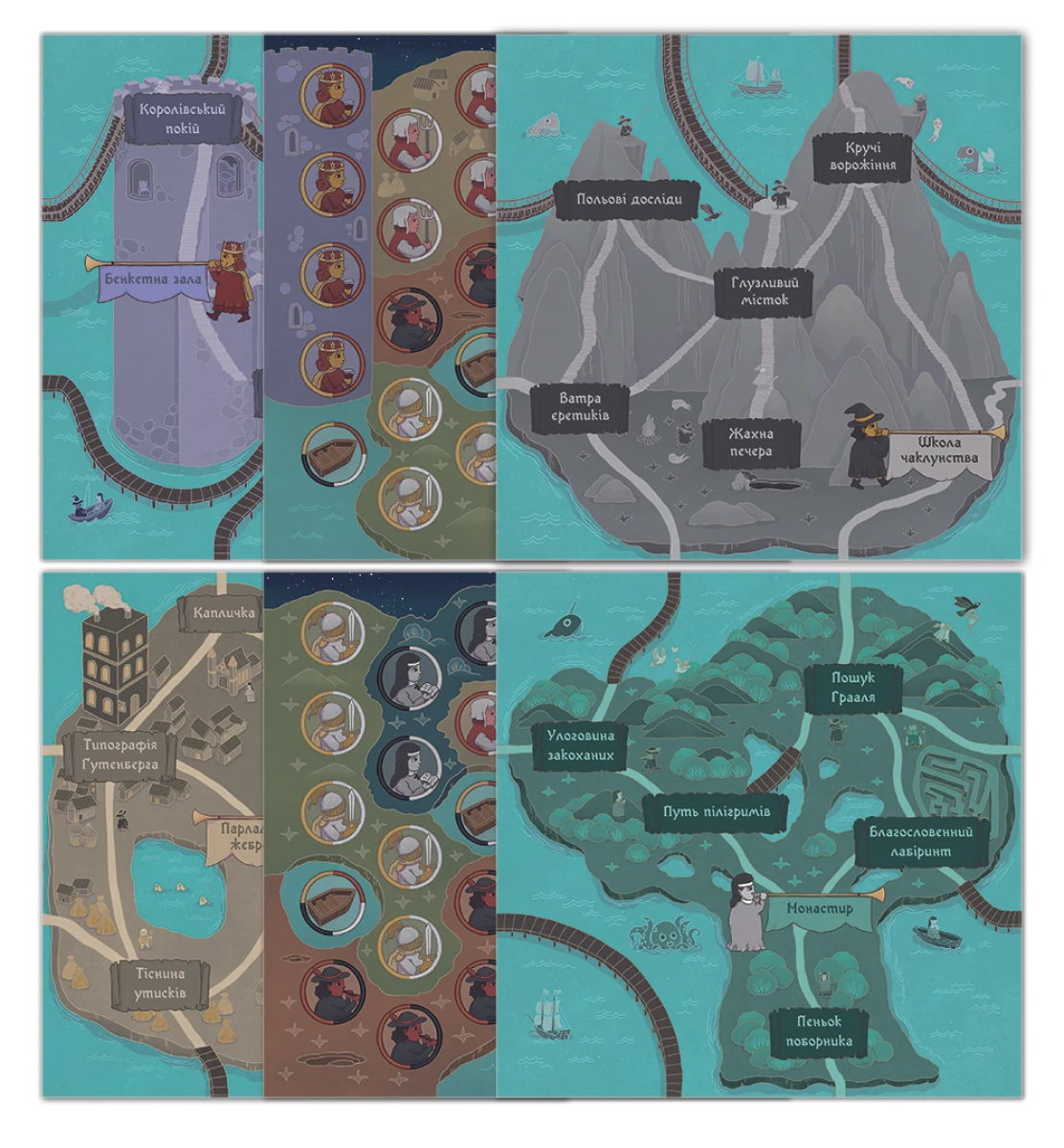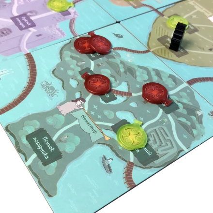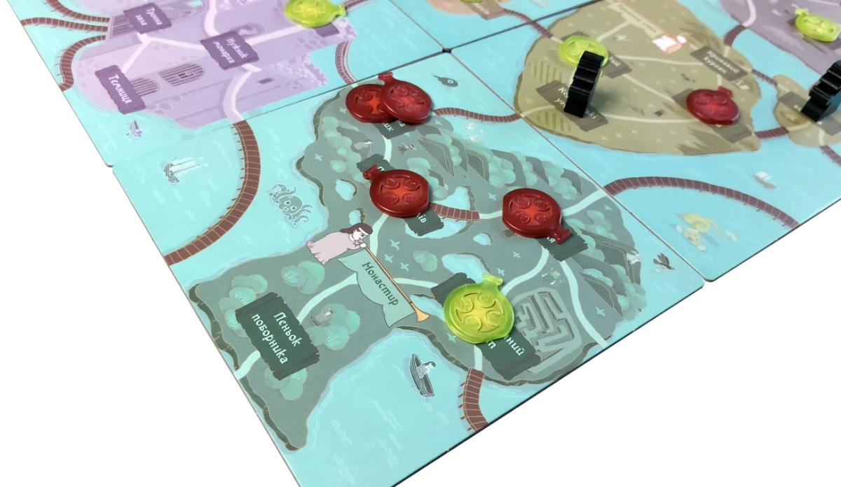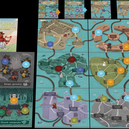 - Спочатку зберіть ігрове поле, випадково розмістивши шість його фрагментів суміжно одне до одного, по два фрагменти у три ряди. Ця мапа поділена на зони зі своїми символами та назвами сцен, що відповідають великоформатним ілюстрованим картам, за вплив на які змагатимуться учасники.