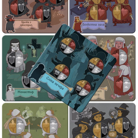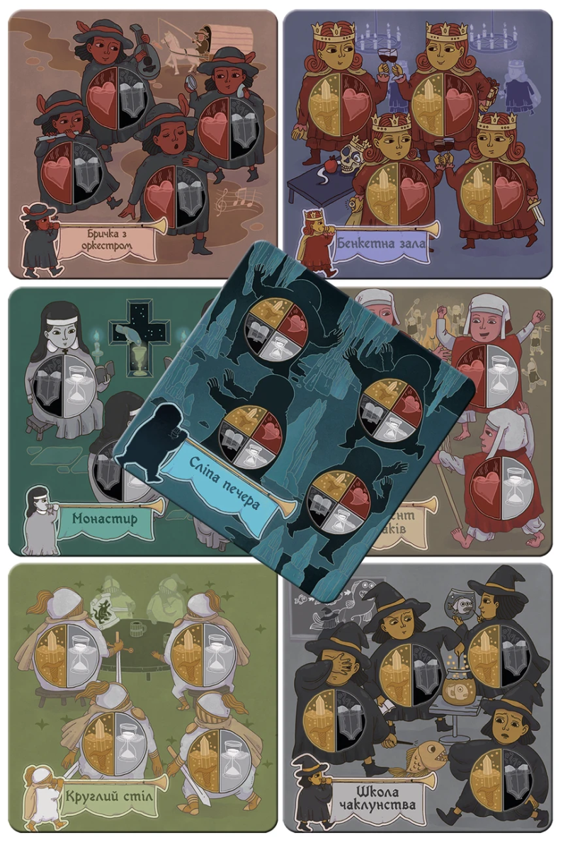 - В центрі кожної зони є окремо підписана сцена "вечірки". Ці сцени зображені на квадратних картах меншого формату. розмістіть ці карти праворуч від зібраного поля.
