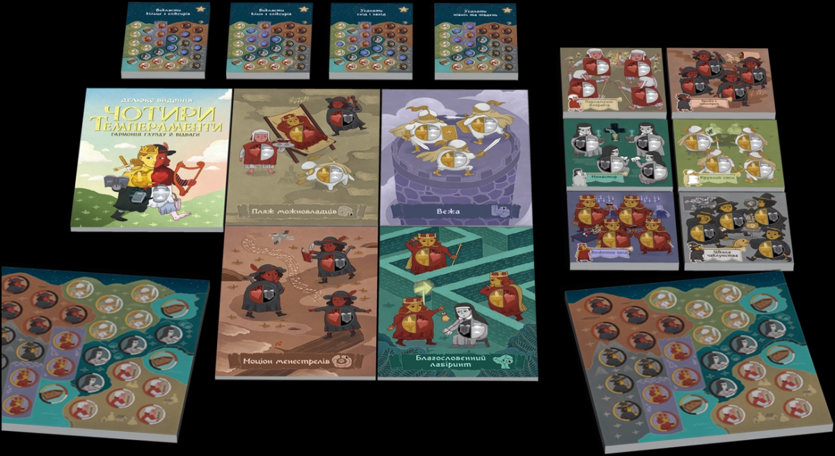 «Чотири темпераменти» - це гра про риси характеру найрізноманітніших персонажів казкового королівства. Тільки вам вирішувати, у який бік трактувати певні сцени з ілюстрацій на картах гри, й розуміння ходів інших гравців у грі комбінує удачу зі стратегією. Блефуйте, створюйте візерунки на полі королівства, отримуйте перевагу на картах сцен та будуйте маршрути між локаціями на мапі - все це пропонує гра «Чотири темпераменти» із неймовірно атмосферними ілюстраціями, стилізованими під середньовічні літописи.