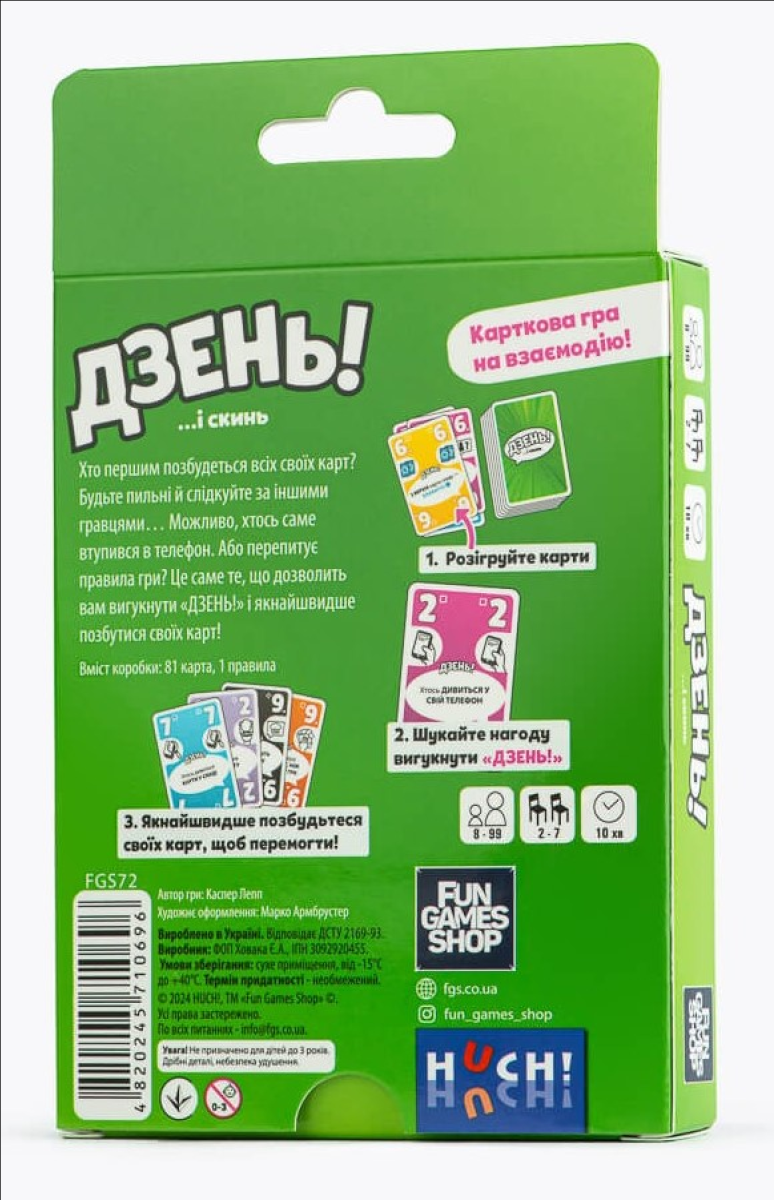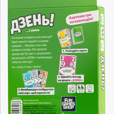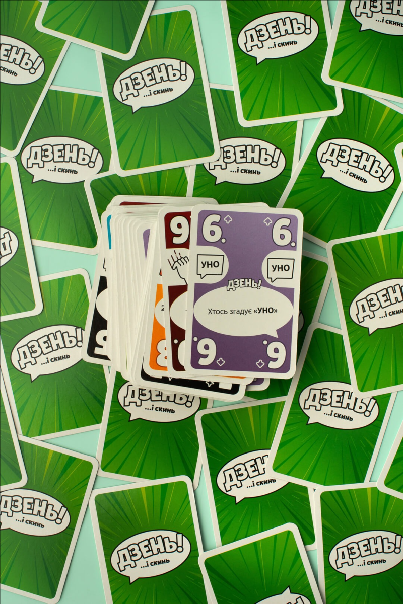 Хто першим позбудеться всіх своїх карт? Будьте пильні й слідкуйте за іншими гравцями… Можливо, хтось саме втупився в телефон. Або перепитує правила гри? Це саме те, що дозволить вам вигукнути «Дзень!» і якнайшвидше позбутися своїх карт!