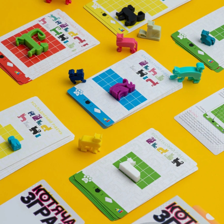 Обираєте одне з 44 завдань. На кожному завданні вказаний рівень та ступінь складності. Щоб зрозуміти принцип, рекомендується починати з Початкового рівня (Starter). Картку потрібно викласти на рівну поверхню, щоб коти не ковзали та не переміщувались по полю. Біля картки завдання викладаємо всіх котів, які необхідні для виконання саме цієї задачі, та розпочинаємо вирішувати головоломку.