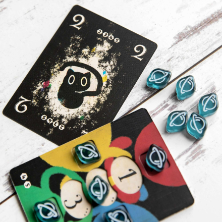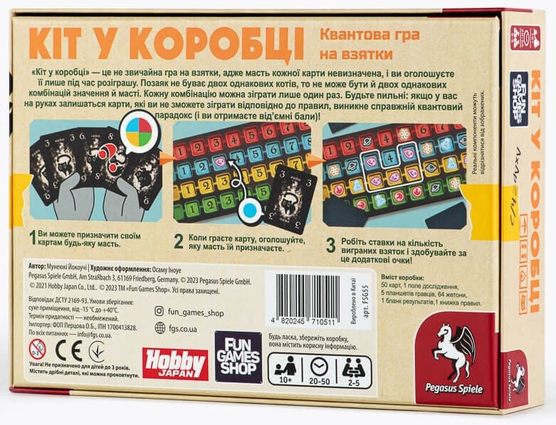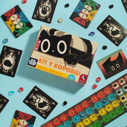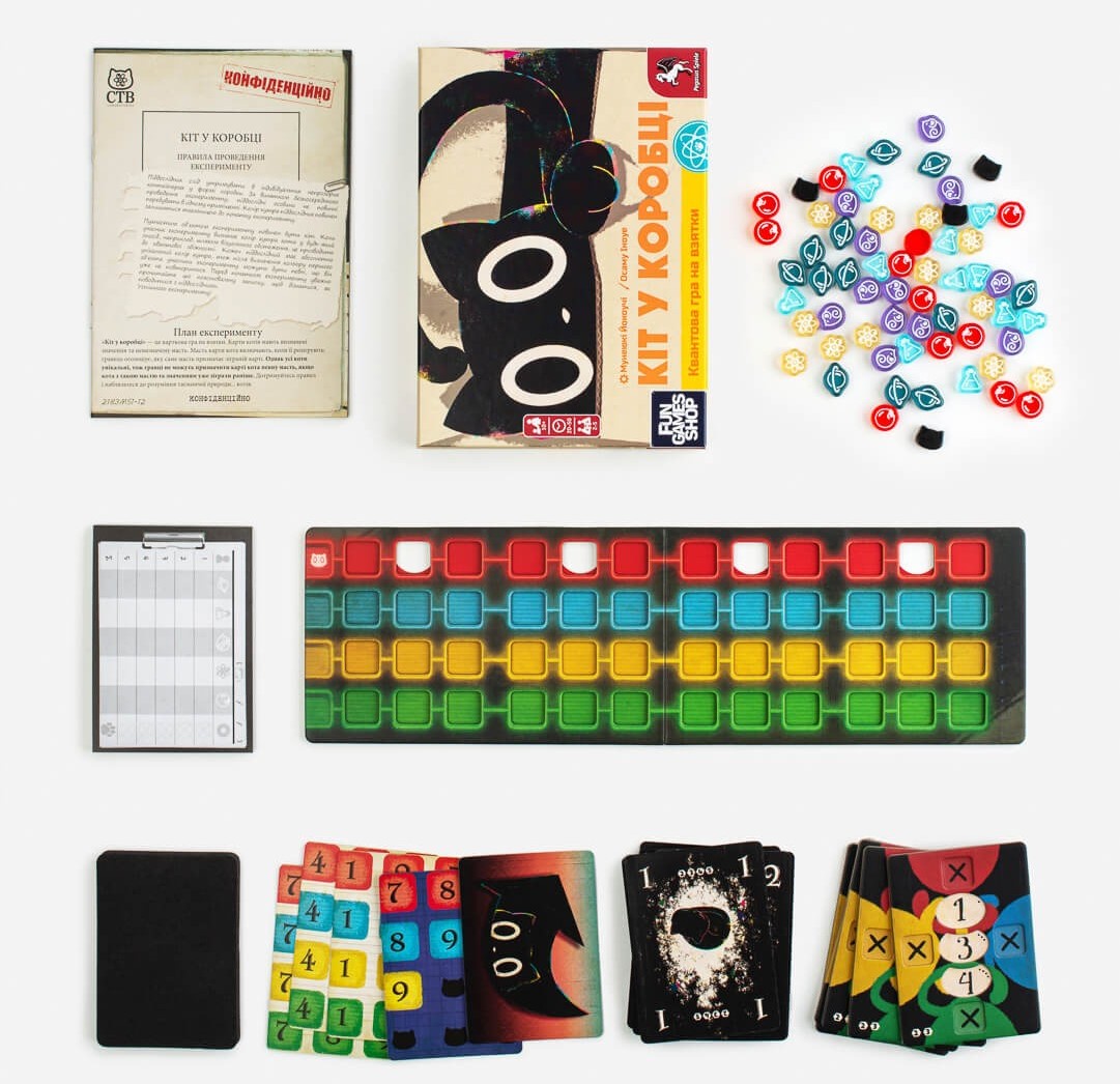 «Кіт у коробці» – це квантова гра на взятки. Як відомо, немає двох абсолютно однакових котиків, а отже, у грі не зможуть брати участь карти, що збігаються водночас за мастю та значенням. Чому котики квантові? Усі карти мають значення, проте не мають масті – ви призначатимете карті масть у момент розігрування!