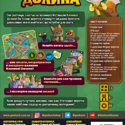 Перед вами нова сімейна гра у світі популярного «Лісового затишку»! «Кленова долина» — це надзвичайно затишна економічна стратегія на мандрування шляхами, розпоряджання ресурсами, збирання друзів і створення гостинців. На меті ви матимете завоювати якнайбільше сердець на щорічному весняному фестивалі. Здебільшого ви здобуватимете очки за створення гостинців, кожен із яких знадобиться для певної забави, проте велика ватага друзів, колекція нашивок і ресурси в запасі також принесуть вам очки. Ви маєте безліч можливостей закарбувати цей фестиваль у пам’яті мешканців Кленової Долини!