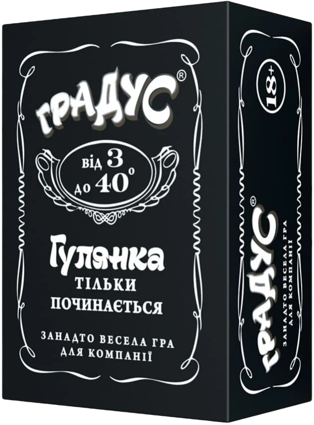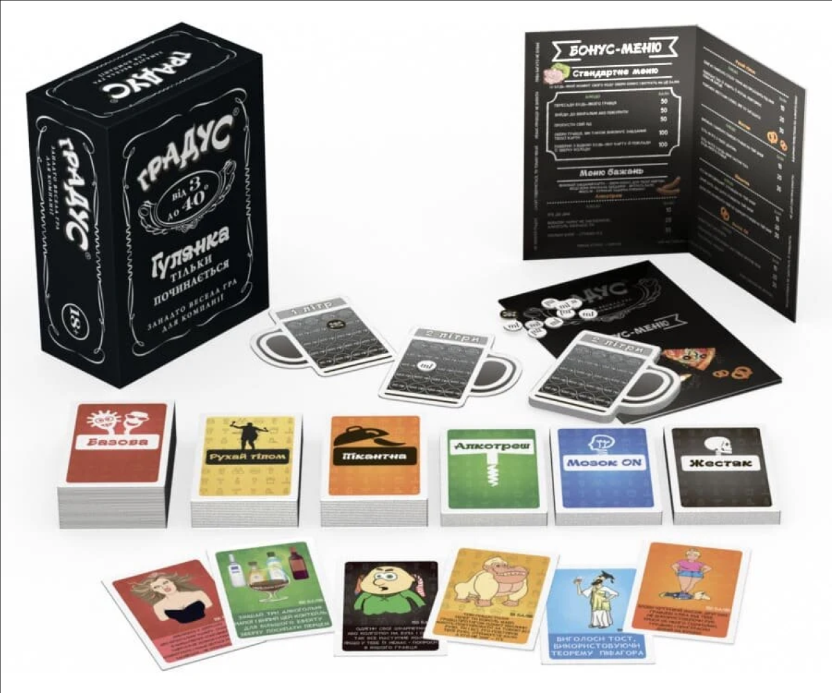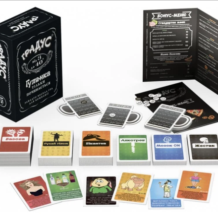 Захоплююча гра на алкогольну тематику, що відноситься до сімейства ігор «Йорж». Настільна Застільна гра «Градус» - це суперновинка від вітчизняного виробника. Гра призначена тільки для дорослих, для осіб, яким вже дозволено пити за законом. Вона підвищить градус вашого настрою і зробить дружню вечірку по-справжньому феєричною.
