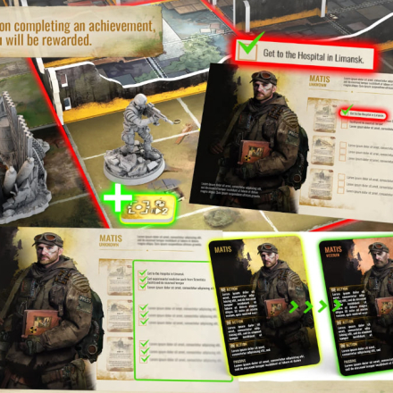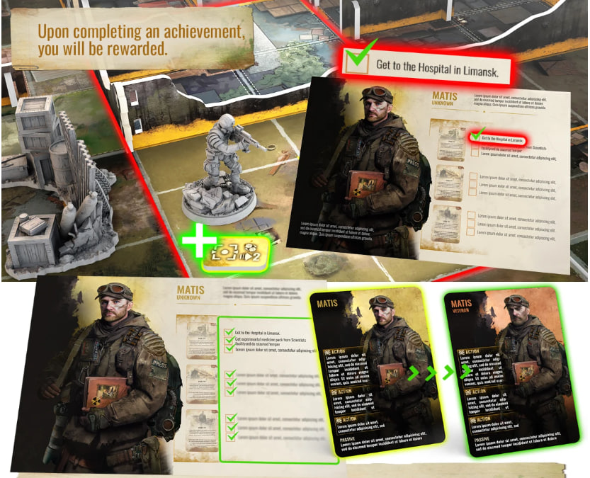 Досягнення. Кожен сталкер має власні особисті досягнення, які вважаються виконаними лише після того, як будуть виконані всі умови, що зазначені на аркуші персонажа. Після виконання умов досягнення, зробіть позначку на аркуші й прочитайте відповідний спогад (який можна знайти на наступних сторінках книги правил). Потім отримайте зазначені нагороди (кожна картка персонажа має свій спеціальний код, що дозволяє легко її знайти) й продовжуйте гру. Зверніть увагу, що порядок досягнень на аркуші не пов'язаний із нагородами, які ви отримуєте.