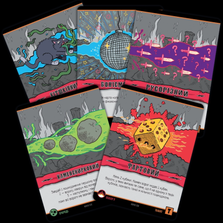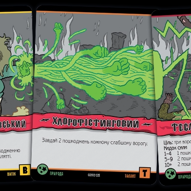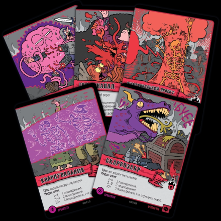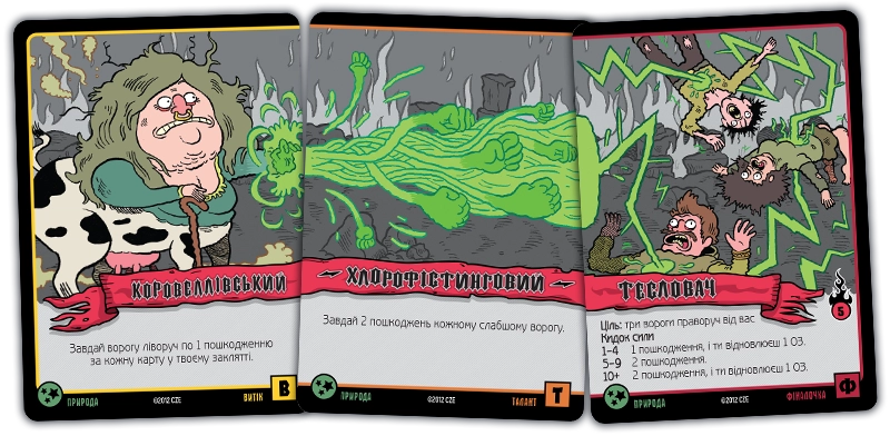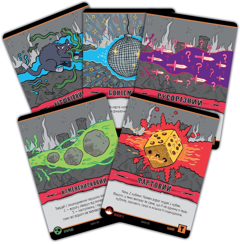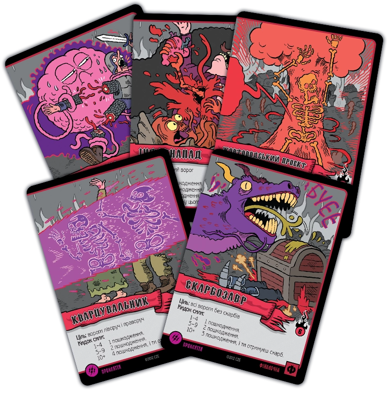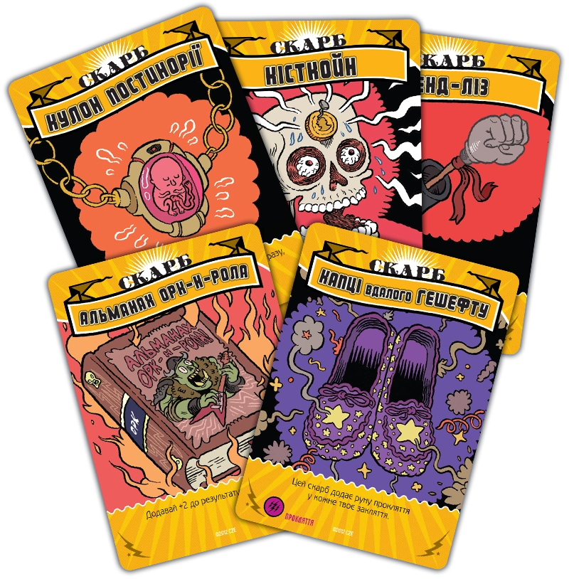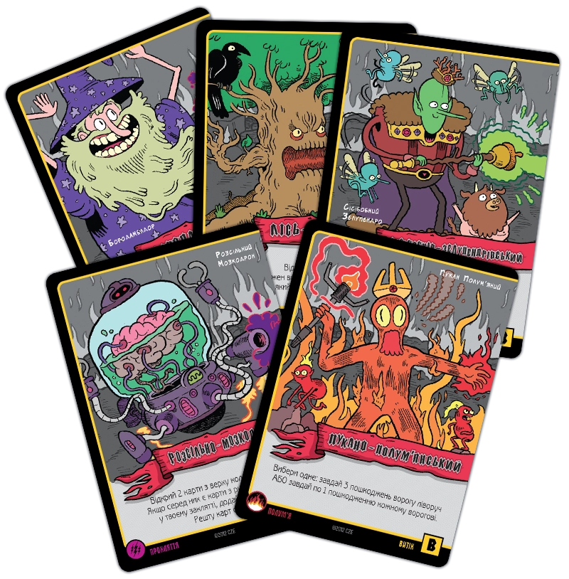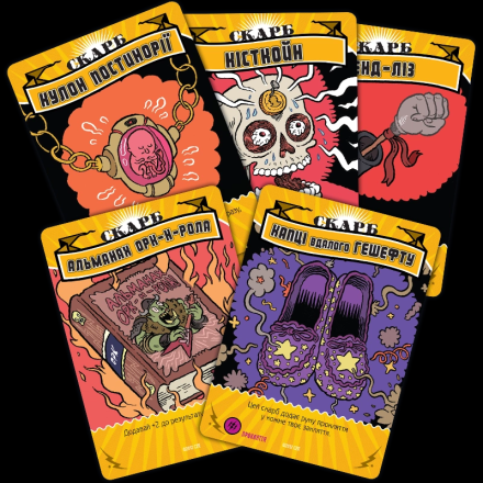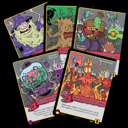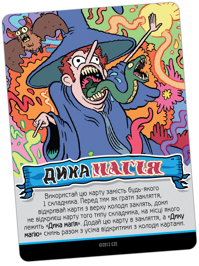 Карти заклинань можуть належати до різних шкіл магії. Школа мороку - це виколи собі одне око, щоб ворог втратив два. Трава дозволяє магу підлікуватися. Пристріт якось пов'язаний зі скарбами. Угар і кумар – дві сторони однієї медалі, обидві не надто приємні для противників. Часто заклинання вимагає кинути кубик, причому гравець отримує один додатковий кубик за кожну карту відповідної школи магії. Карти скарбів дають різні бонуси власникам, а карти шаленої магії використовуються як джокери при складанні заклинання.